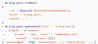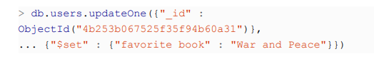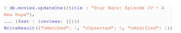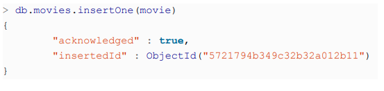 <p>>db.movies.insertOne({ "title" : "Star Wars: Episode IV - A New Hope", "director" : "George Lucas", "year" : 1977 })</p>