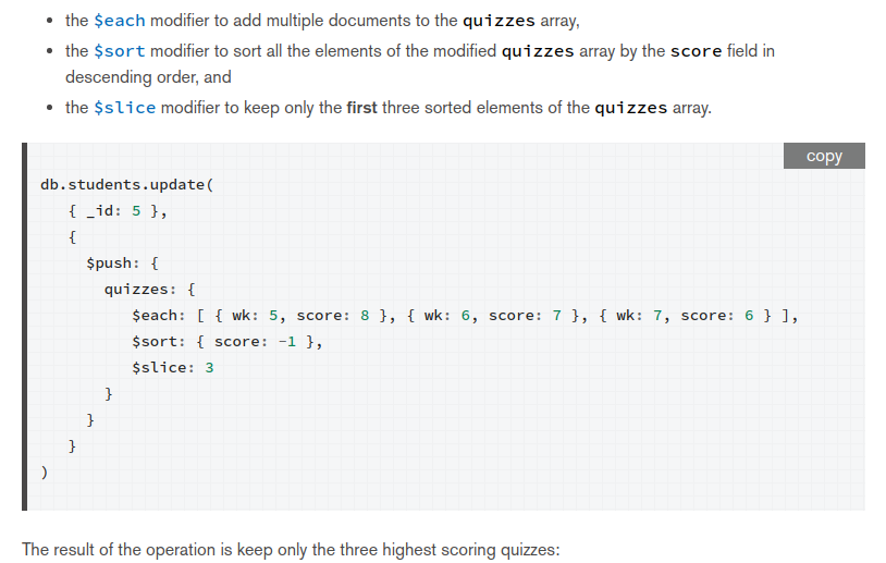 In many cases, though, we don’t know what index of the array to modify without querying for the document first and examining it. To get around this, MongoDB has a positional operator, $, that figures out which element of the array the query document matched and updates that element.