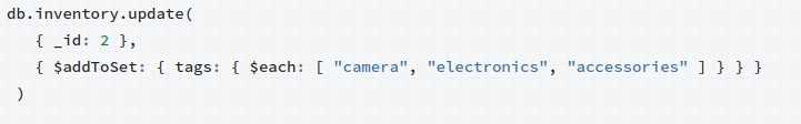<p>{ $addToSet: { : , ... } }</p>