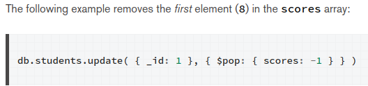 <p>The<strong>$pop</strong>operator removes the first or last element of an array. Pass$popa value of-1to remove the first element of an array and1to remove the last element in an array.</p>
