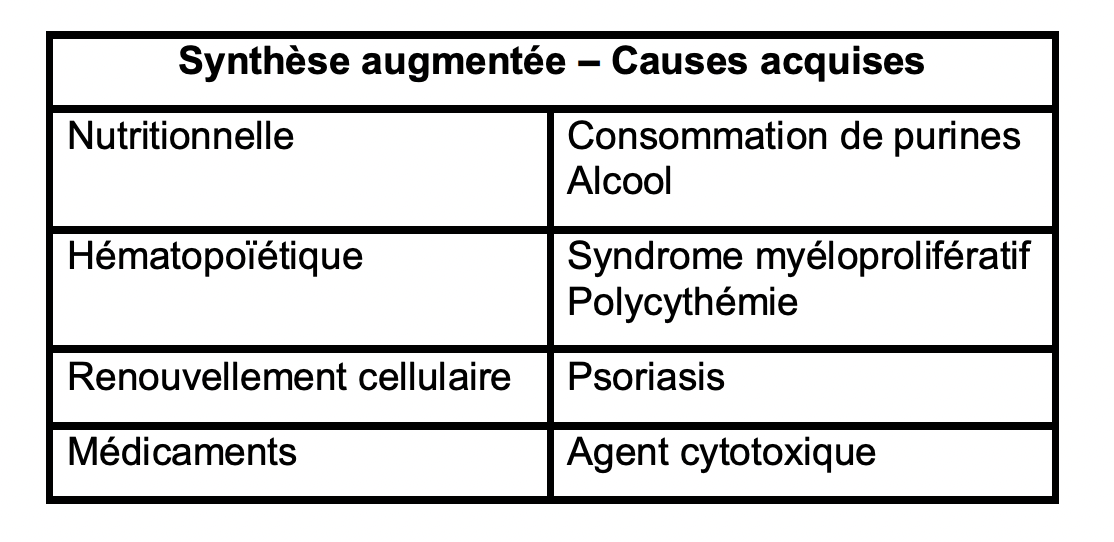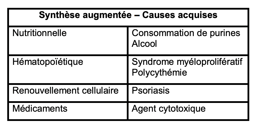 - quelles sont les causes d’augmentation de synthèse d’acide urique ACQUISES?