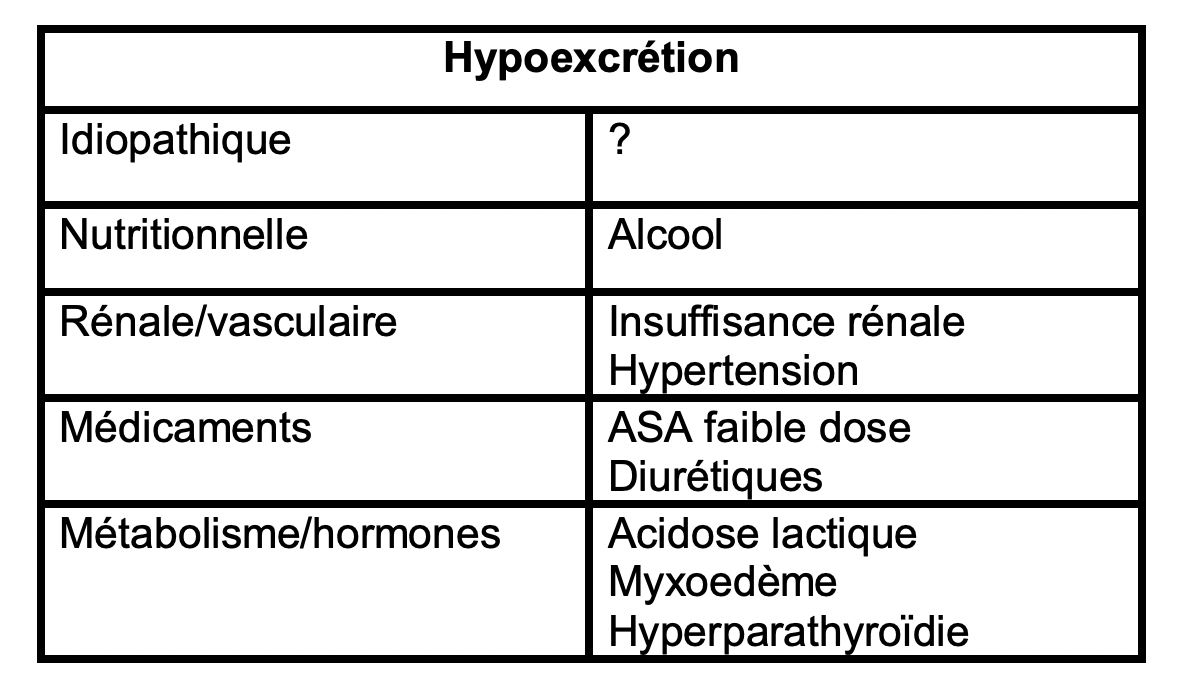 - quelles sont les causes de diminution d’excrétion de synthèse d’acide urique ACQUISES?