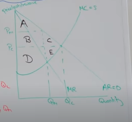producer surplus Pc, Qc (area below price but above the supply curve/ MC curve)= D + E