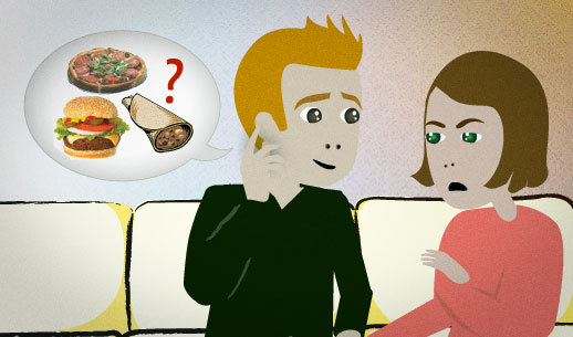 You’re having a conversation about something with your boyfriend, and he interrupts to ask what’s for dinner. You’re annoyed that he always talks about food. You say: