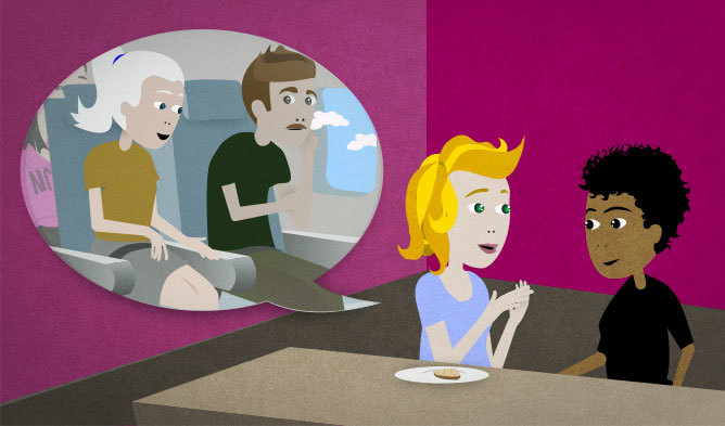 Your mother is very outgoing and talkative. You’re describing her to a friend. You give an example of her outgoing behavior.