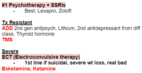 ECT is 1st line if suicidal, severe wt loss, real bad
