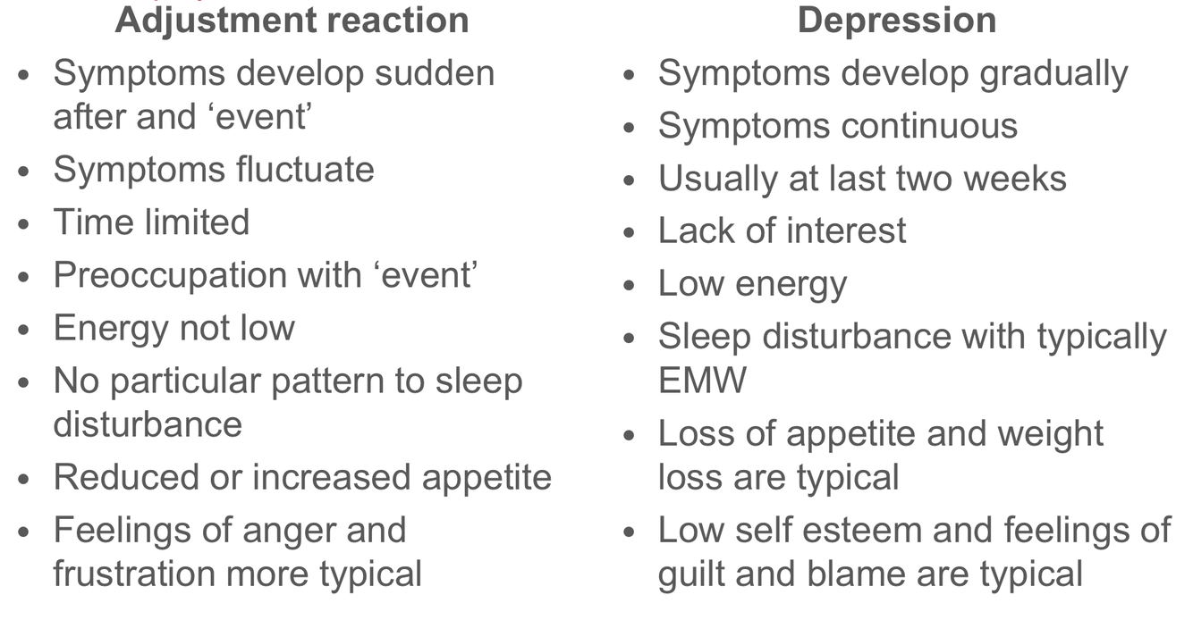 How does depression differ from an adjustment reaction (i.e. adjusting to a normal life event)?