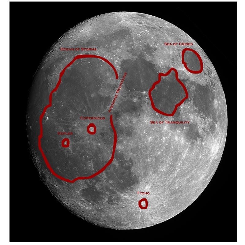 Dark patches on the moon (no actual water) e.g. sea of storms (oceanus proceliarum). they are formed when the the moon was cooling from molten rock. It shrank at different rates causing basins.
