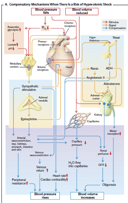 Compensatory: increase HR, vasoconstriction > BP and BV rises