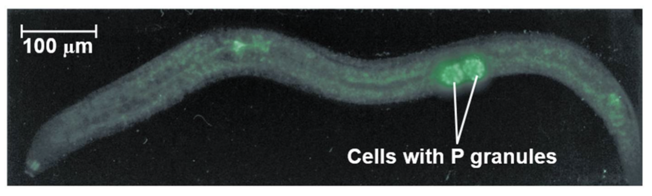 o P granules are present in both the ____ and adult gonads of this organism.