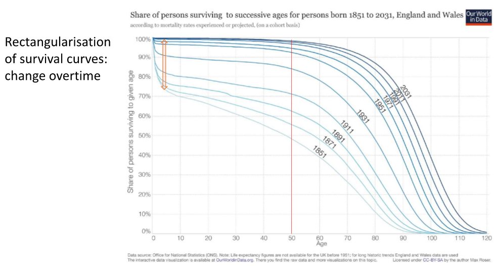 Primarily occurs because of redutcion in mortality in the younger ages - push survival rate into rectangular shape.