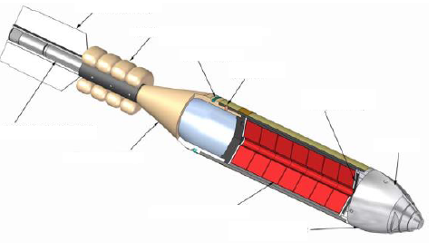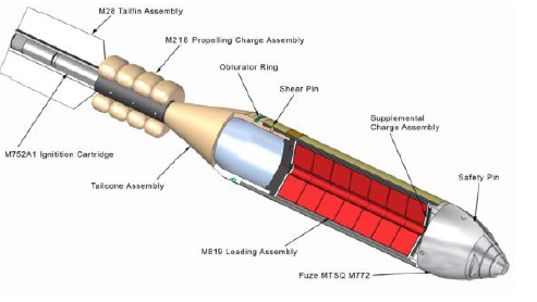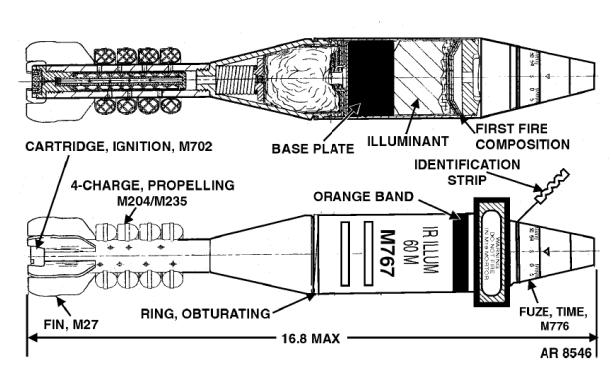 At preselected flight time, fuze functions resulting in initiation of the fuze booster. The internal pressure build up as a result of the fuze booster causes separation of the front and tail cone sections of the mortar body by fracturing the shear pins. On separation of the mortar body, the M853A1 Illuminating Assembly is ejected rearwards from the front section of the mortar body. Simultaneously the fuze booster initiates the ignition system of the illuminant canister. Deployment of the parachute assembly controls the rate of descent of the illuminant canister. The canister burns a minimum of 50 seconds generating at least 525,000 candela within a 1200m diameter area.