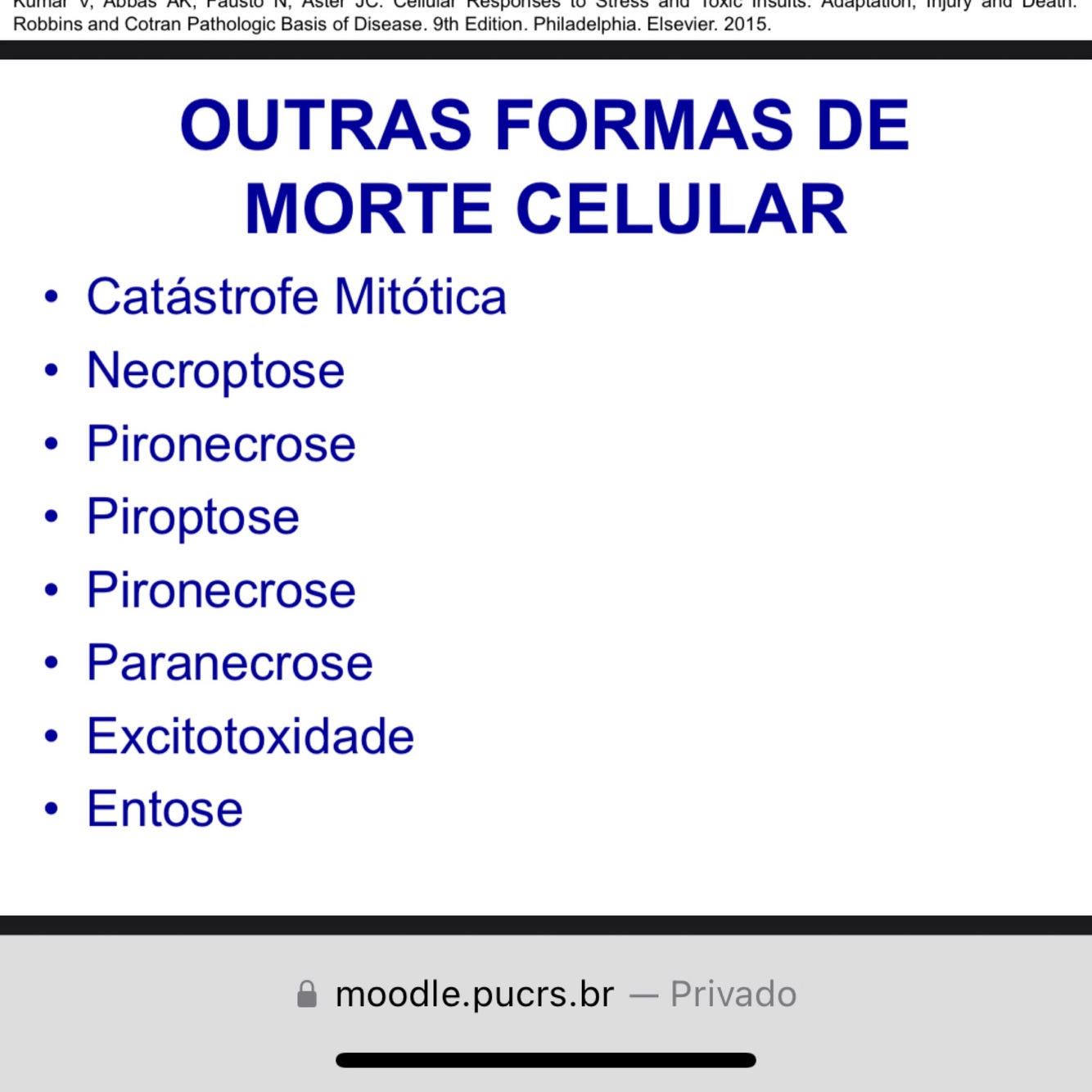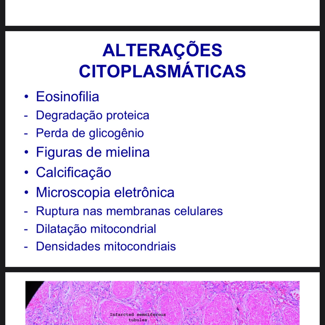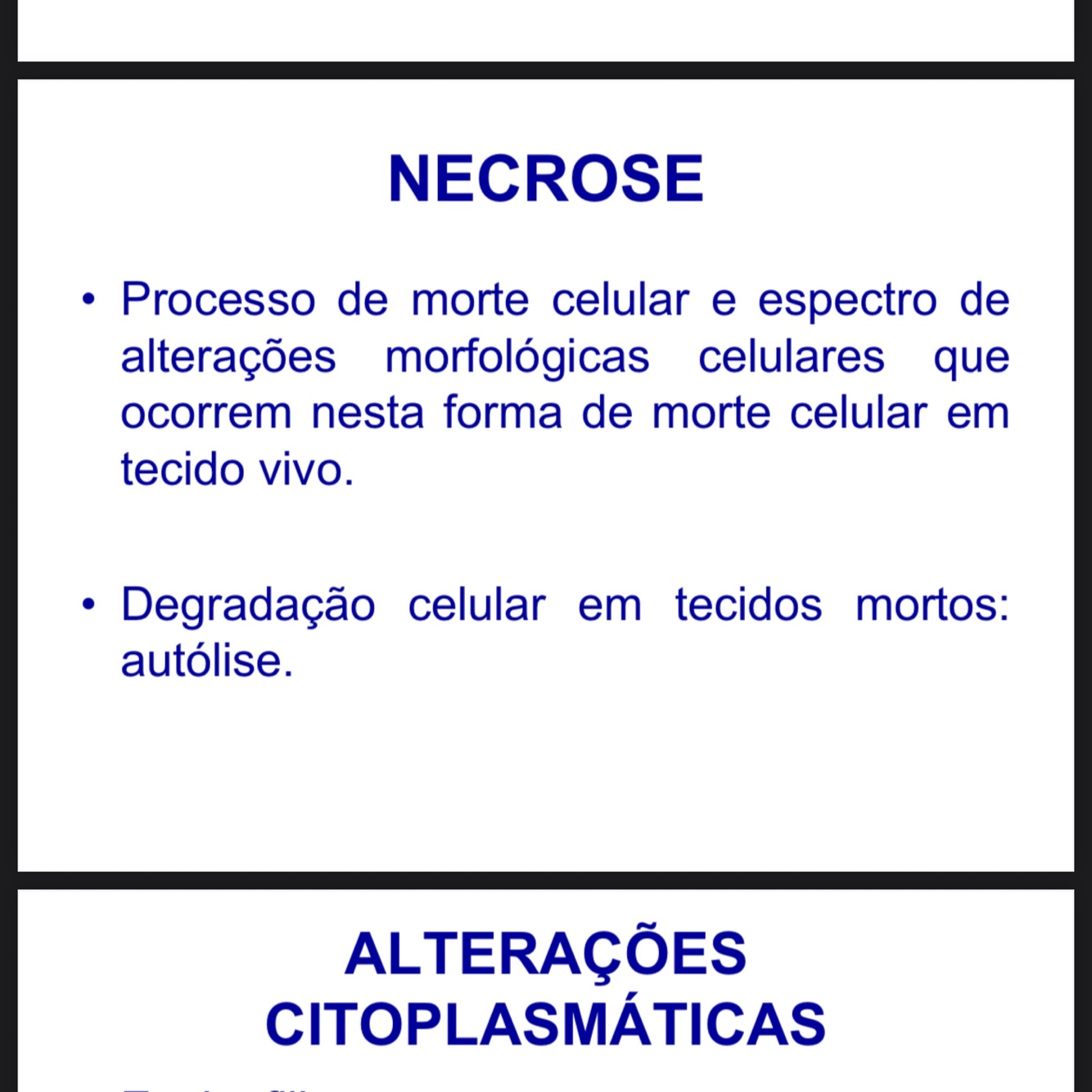 A imagem contém informações sobre alterações citoplasmáticas associadas à morte celular, particularmente durante o processo de necrose. Vou detalhar cada um dos pontos mencionados na imagem: