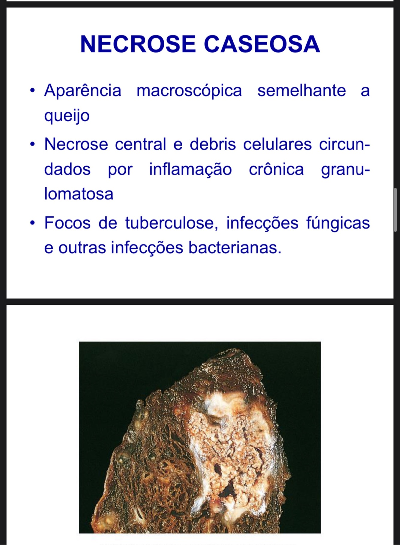 • O tecido morto adquire uma aparência granulosa e branca, semelhante a queijo, devido à destruição celular incompleta.