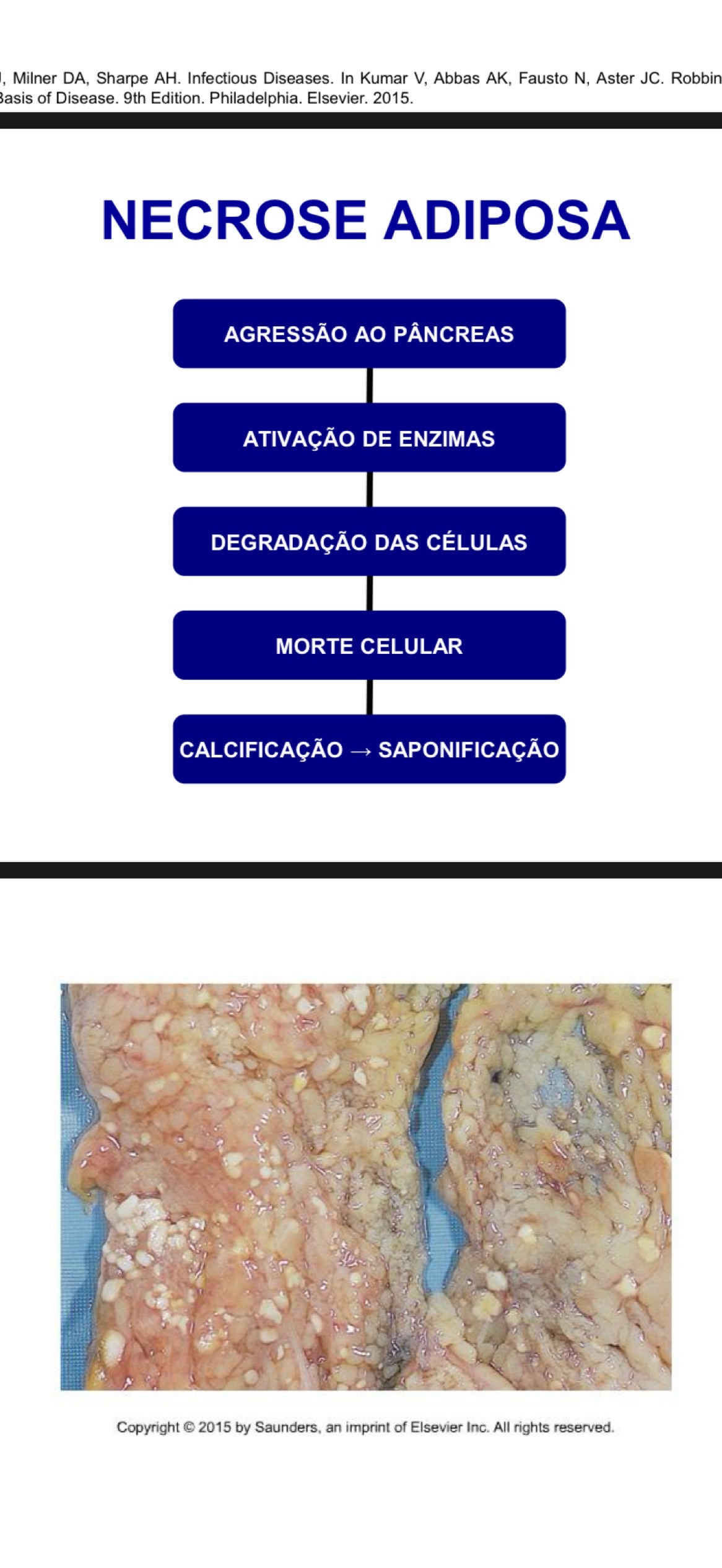 • Ocorre em tecidos adiposos, muitas vezes após traumatismos ou pancreatite aguda.