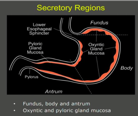 gastrin from G cells in the antrum (released in endocrine mechanism- into circulation to induce acid secretion via binding to parietal cells)