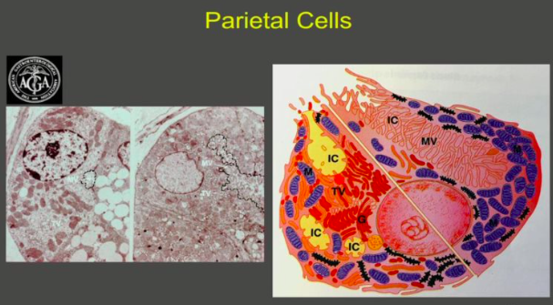 NOTE: the white fat looking circles are tubular vesicles which house the H/K+ ATPase needed to pump acid into the lumen and the brown things are mitochondria needed to generate ATP