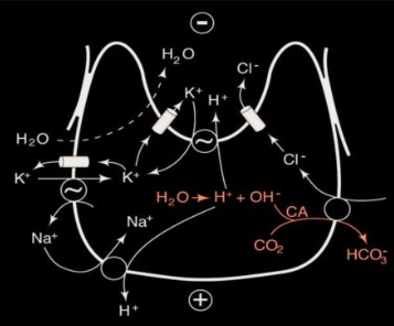 Water in the cell dissociates into H+ and OH- and the H+ is exchanged into the GI lumen for K+ via a H+/K+ ATPase while the OH- combines with CO2 to form carbonic acid and then HCO3- which exits via the basolateral membrane into blood in exchange for Cl- which then passively diffuses into the GI lumen