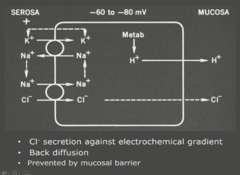 H+ and Cl- cannot backflux into the epithelium from the lumen due to the high electrical gradient maintained by pumping a lot of Cl- into the lumen