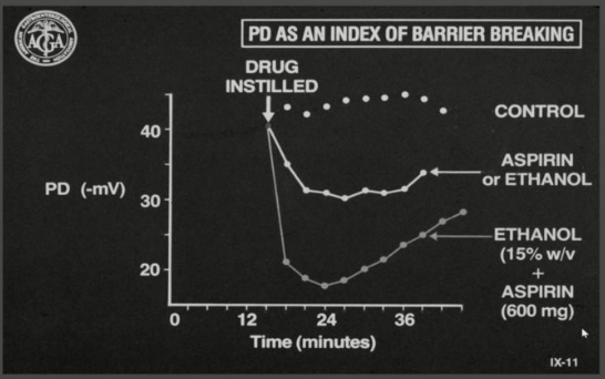 Since this is normal, a less negative gradient (due to things like ethanol and NSAIDs which can allow Cl- backflow into the epithelium via loosened tight junctions) signifies epithelial dysfunction