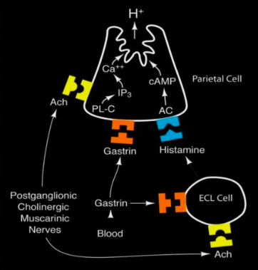 It can directly bind to parietal cells via CCK-2 receptors but mostly works by binding to ECL cells to promote histamine release which then binds to parietal cells (similarly Ach can do both of these)