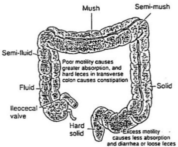 The changes in fluidity of feces is determined by what organ?