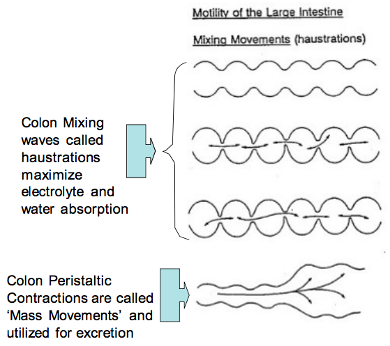 Haustrations: maximize electrolyte & water absroption; segmental contractions bringing feces in close contact w colonic epithelium