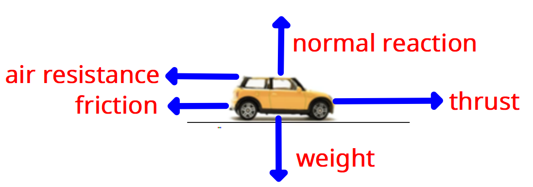 Weight (down), Normal reaction (up), thrust (forwards), air resistance (backwards), friction (backwards)