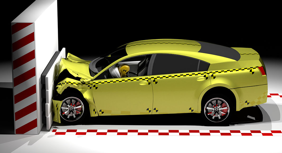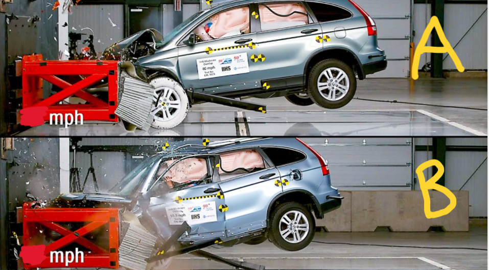 Two identical cars are crash-tested. One is at 56mph, the other is 40mph.