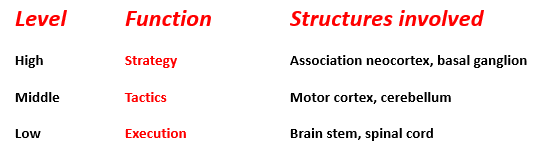 Voluntary movement uses a functional hierarchy with 3 levels, what are these 3 levels?