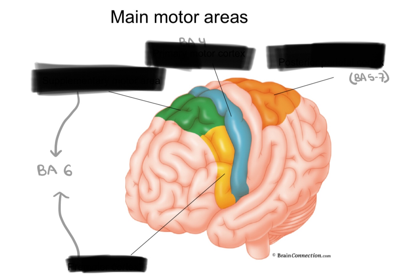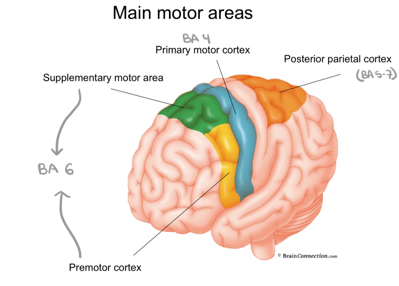 Receive info from: cerebellum, BASAL GANGLIA (involved in movement preparation), parietal area and prefrontal cortex