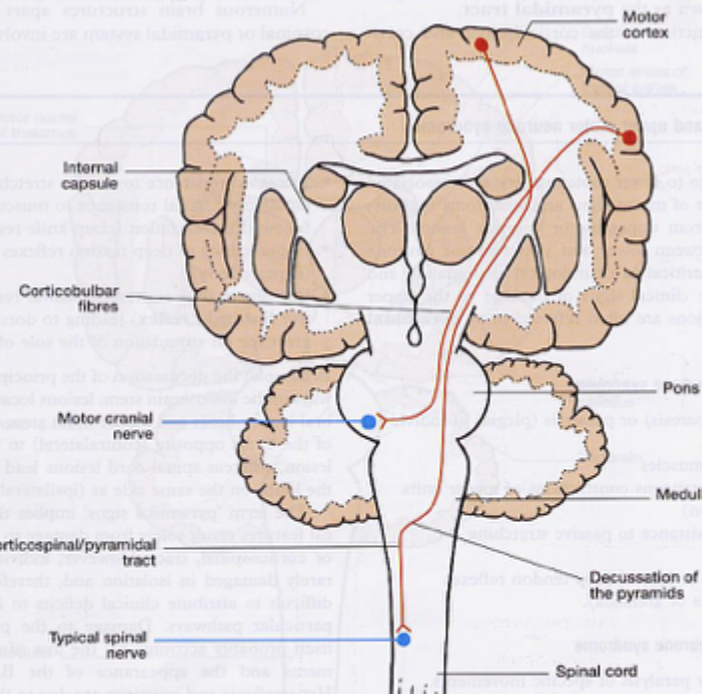 -group of upper motor nerves that start in the cortex and end in the spinal cord