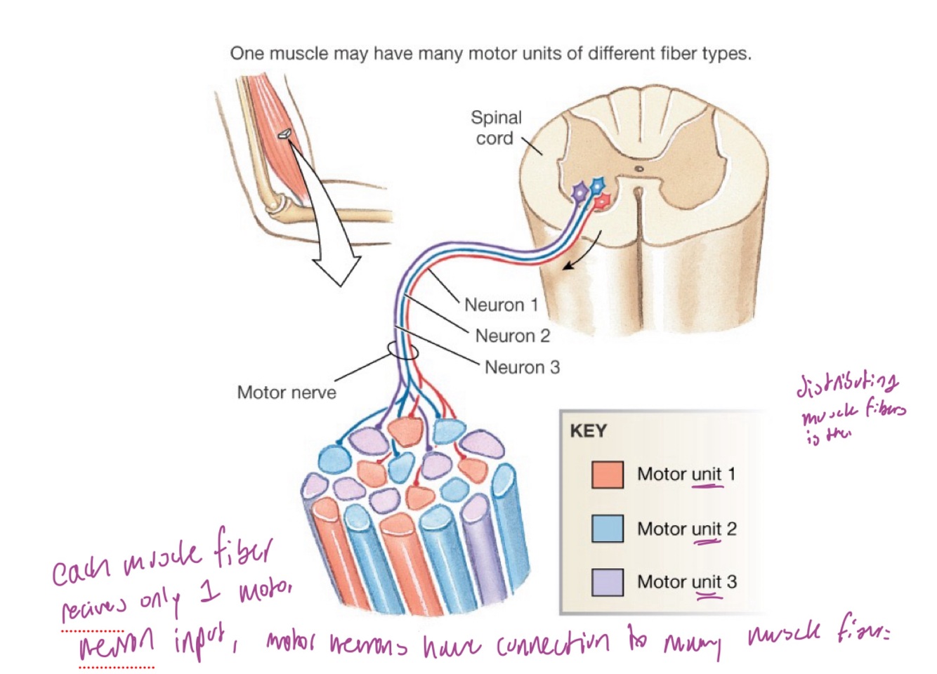ONLY 1 motor neuron innervates a muscle fiber. A motor neuron can Innervate multiple muscle fibers, but it’s 1 neuron per fiber.