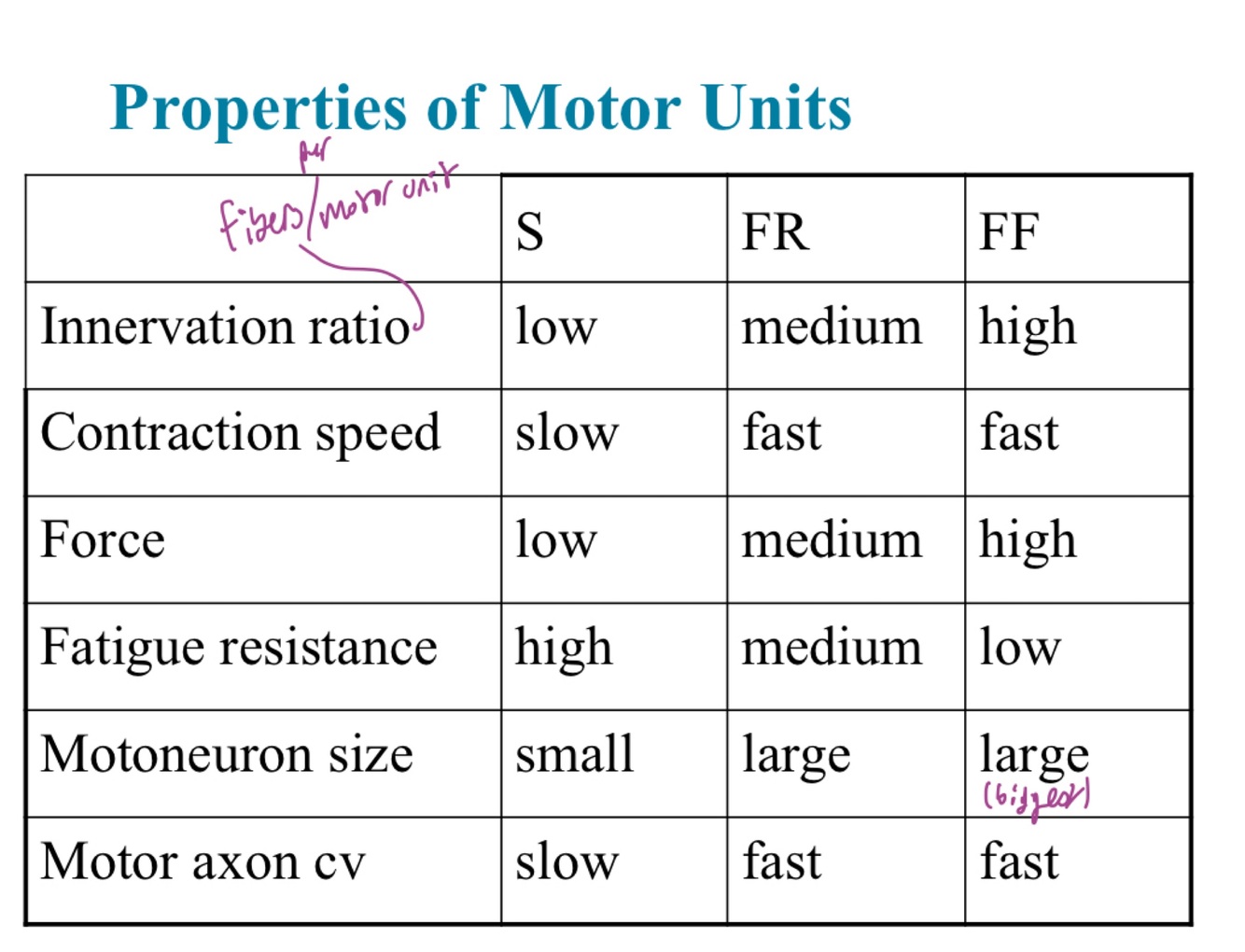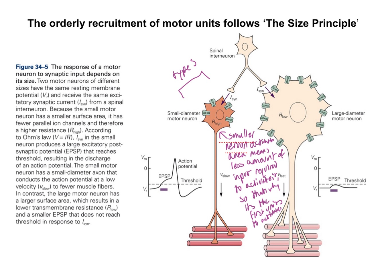 Smallest axon diameter motor unit (aka slowest), meaning smallest cell body of neuron.