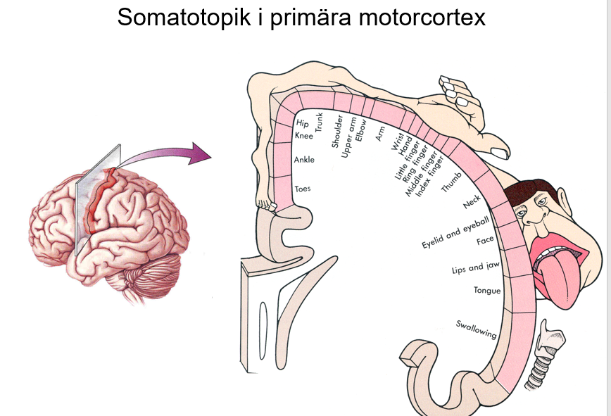Hur ser somatotopiken ut i primära motorcortex?