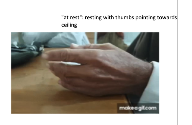 -Hold arms out against gravity (postural tremor) -> Once they settle into their position -> resting tremor