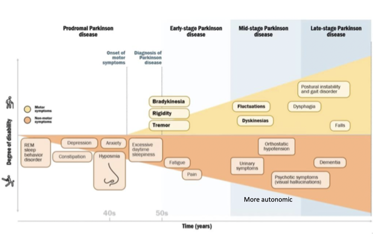 - PD: dementia and cognitive decline is late onset sx