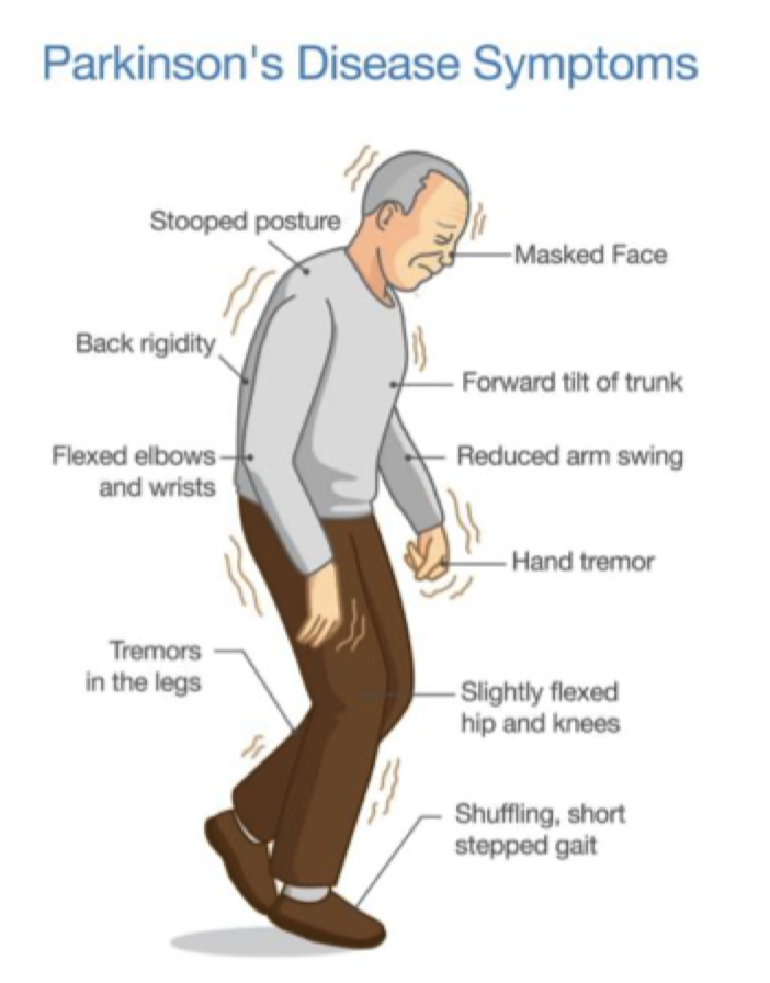 -Less dopamine -> more ACH -> uncontrolled movement