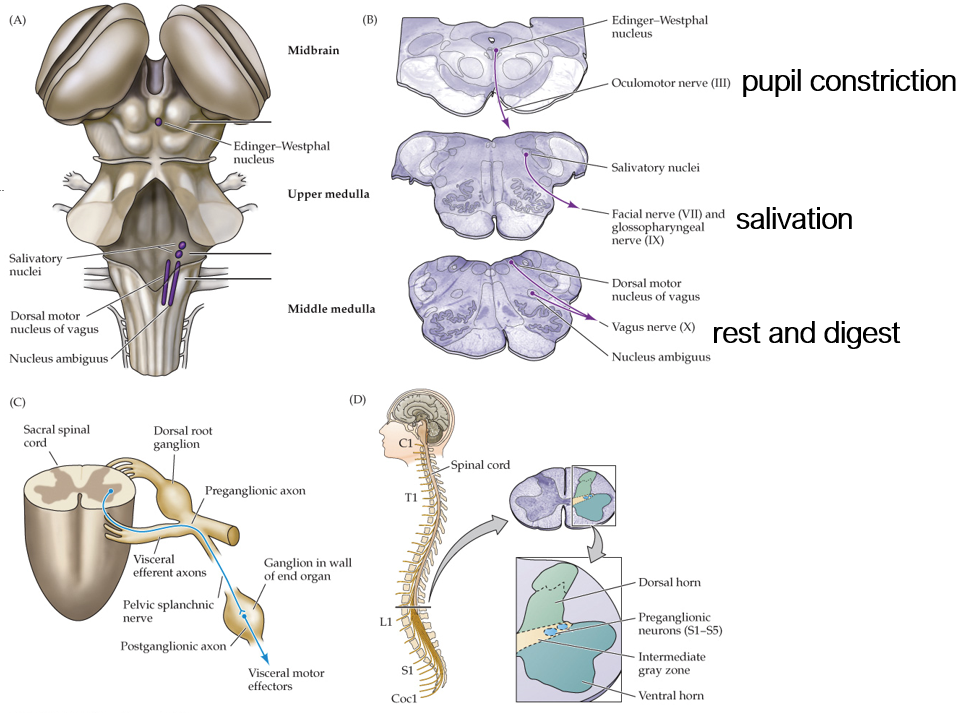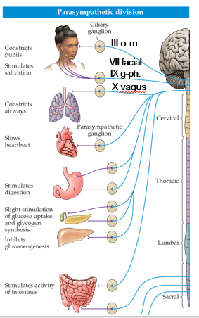 The parasympathetic nervous system is controlled in the brain stem nuclei that send out cranial nerves to the body. Name three brain stem nuclei and their cranial nerves that are important in the parasympathetic nervous system.