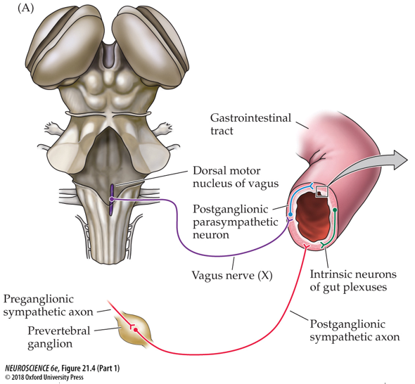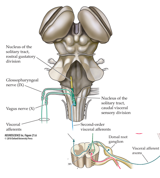 The vagus nerve receives information from the gut lining, for e.g. what’s inside the gut. These afferents terminate in the nucleus of the solitary tract (dorsal to RF).