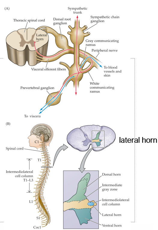 From the lateral horn, the projections go to the ventral horn. From here they go into the white communicating ramus and synapse with postganglionic neurons in sympathetic chain ganglia. The projections can also go on to another ganglion e.g. to the prevertebral ganglion that project to the viscera or to the blood vessels and skin.