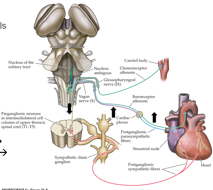 The high BP is received by the baroreceptor afferents, which project to the sensory fibers of the vagus nerve into the nucleus of the solitary tract (NTS) where the information is integrated. The information is then sent into the nucleus ambiguus (motor nucleus for vagus nerve). Here, the vagus nerve efferents are activated, which synapse onto postganglionic parasympathetic fibers in the cardiac plexus. These postganglionic fibers release ACh into the heart, to slow down the heart rate.