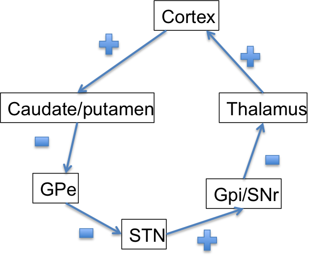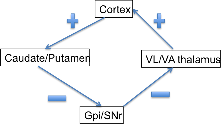 Inhibits indirect pathway and disinhibits direct pathway, therefore promotes movement. Degenerates in PD.