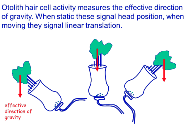 These afferents provide information on the effective direction that gravity is acting (linear acceleration due to gravity): when immobile this can be considered to be a head position signal.