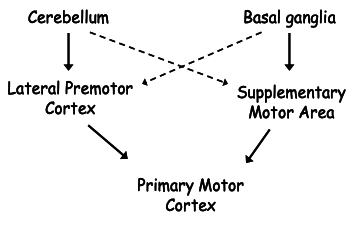 inputs from higher cortical association areas (prefrontal and parietal) and from the cerebellum and basal ganglia.