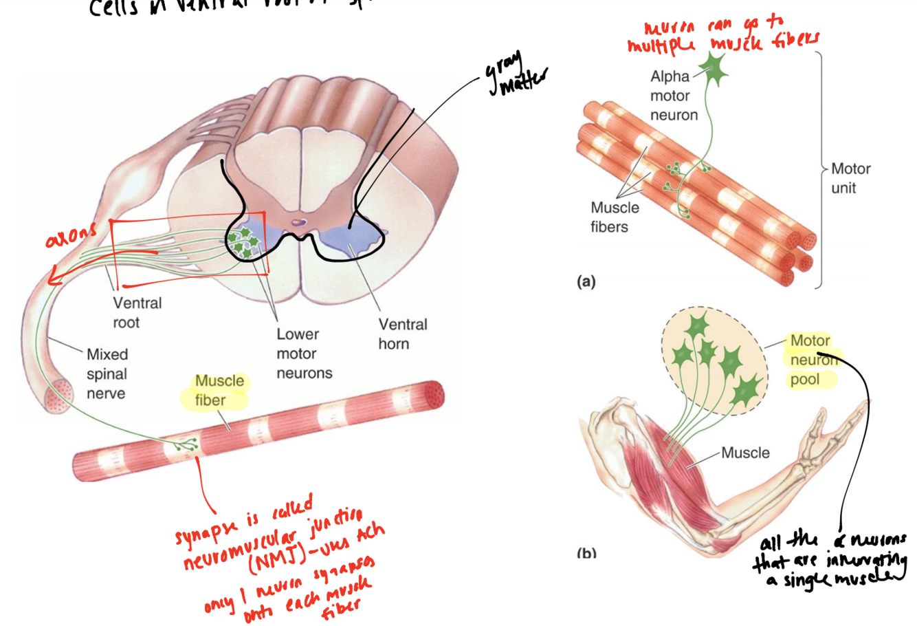 cells in ventral root of spinal cord, cause the contraction of muscles