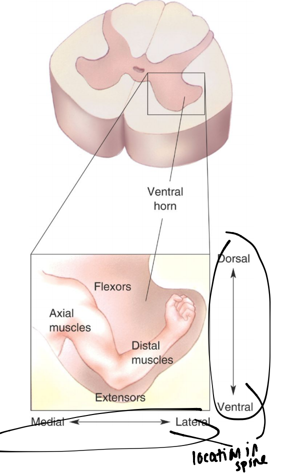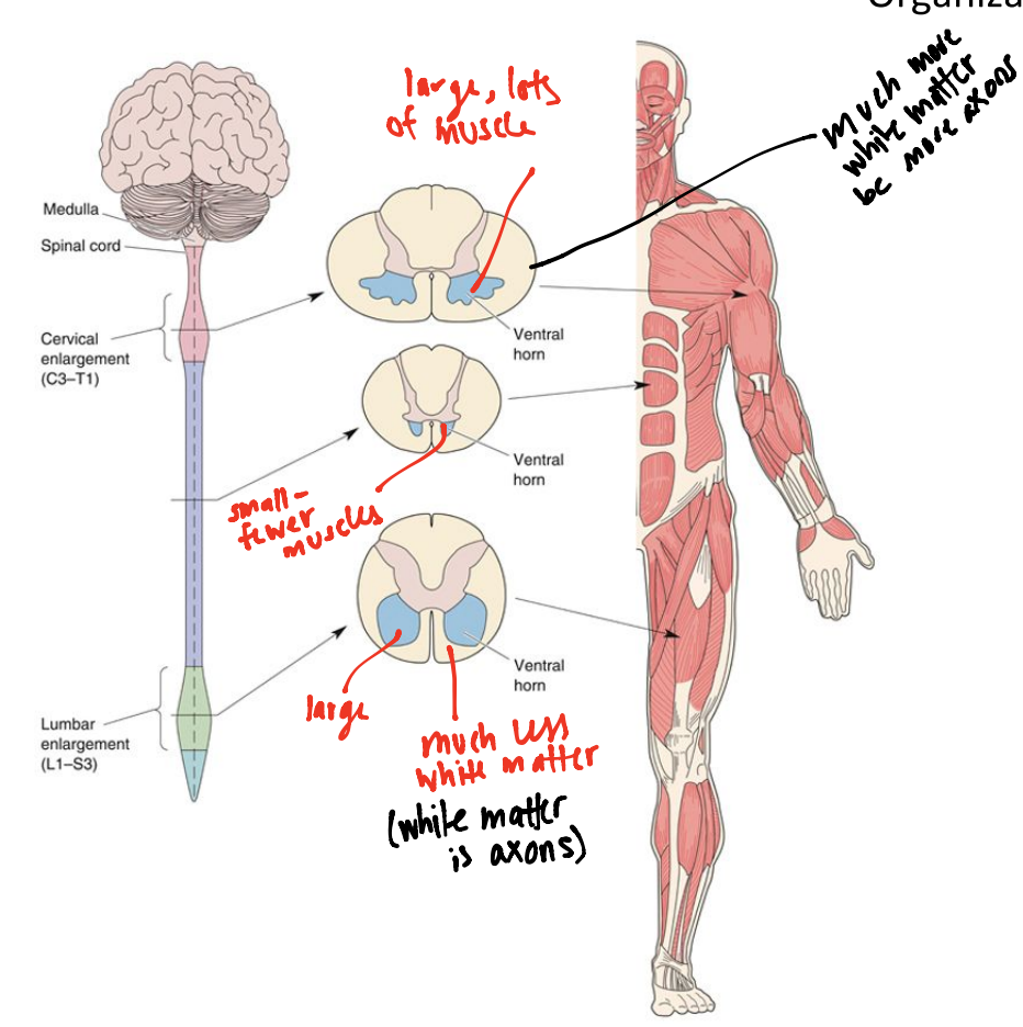 size of ventral horns corresponds to amount of muslce in the area, amount of white matter corresponds to amount of axons in the area (how faw away from brain)