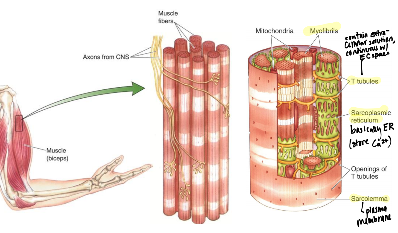 many myofibrils make up a fiber, T-tubules contain extra-cellular solution, sarcoplsmic reciculm is like the ER, sarcolema is the plasma membrane