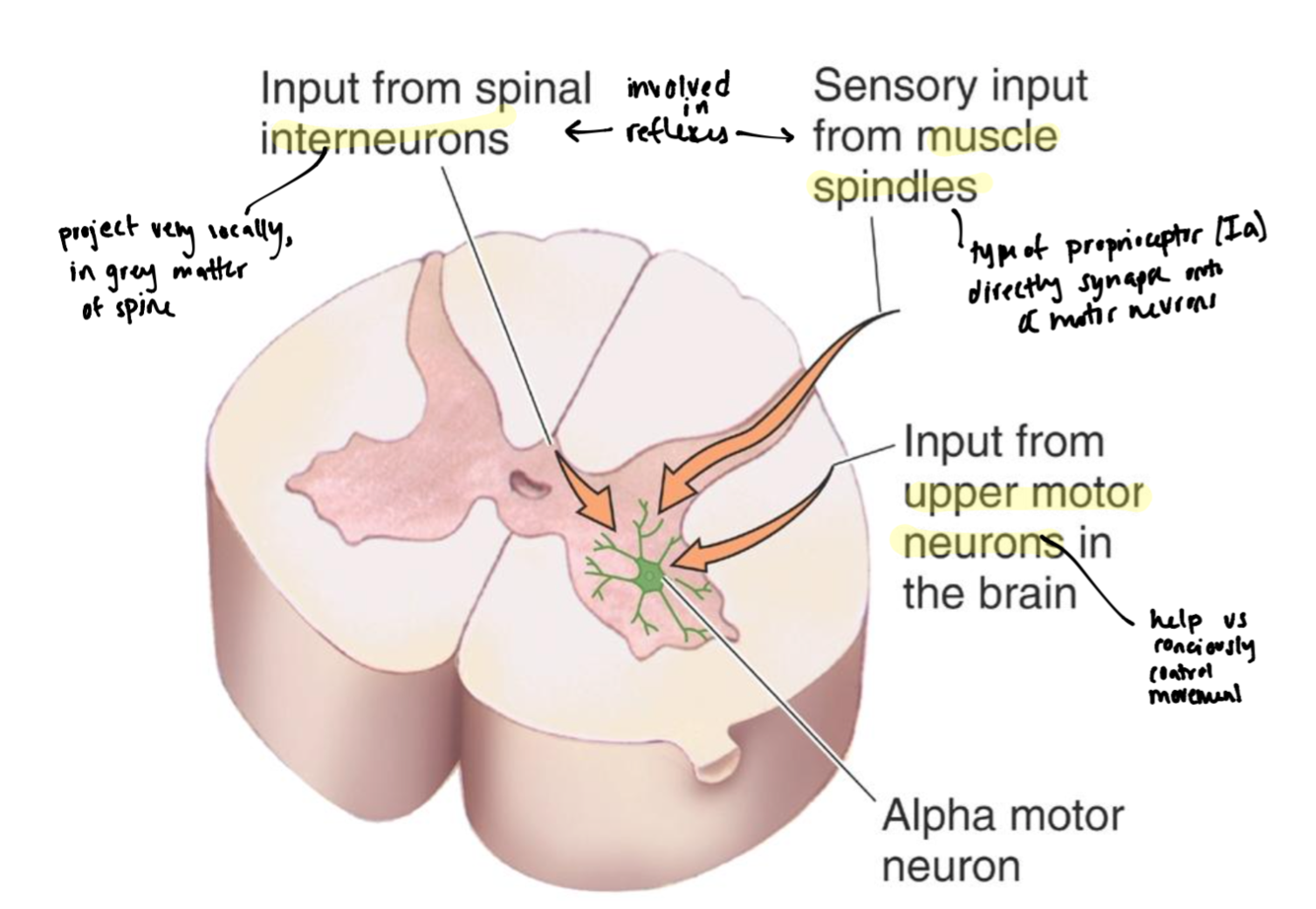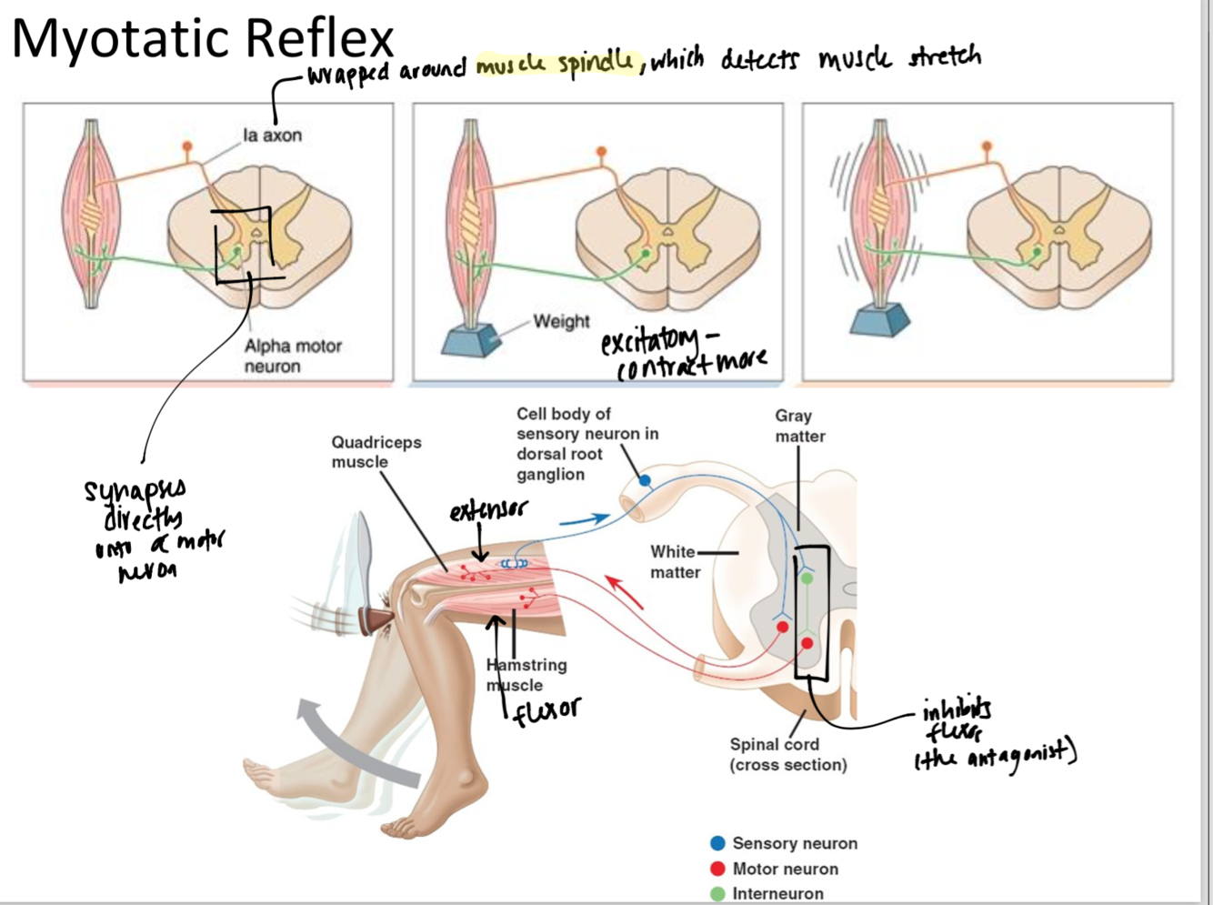 muscle spindles: type pf proprioceptor (Ia), directly synapses onto aplha motor neurons