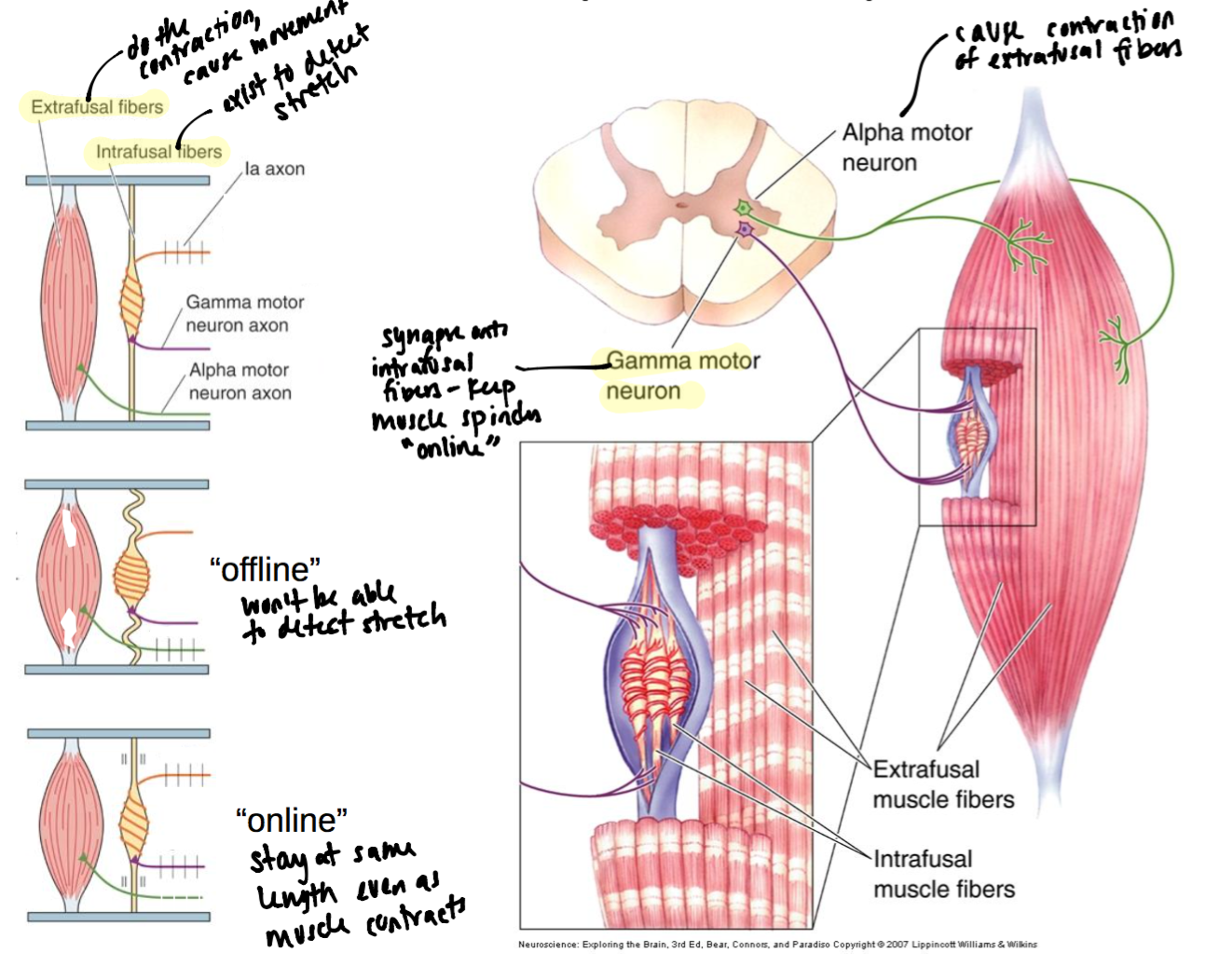 gamma motor neurons send signal to intrafusal fibers so the muscle spindles stay online with the extrafusal fibers (which do the contraction) and can detect stretch